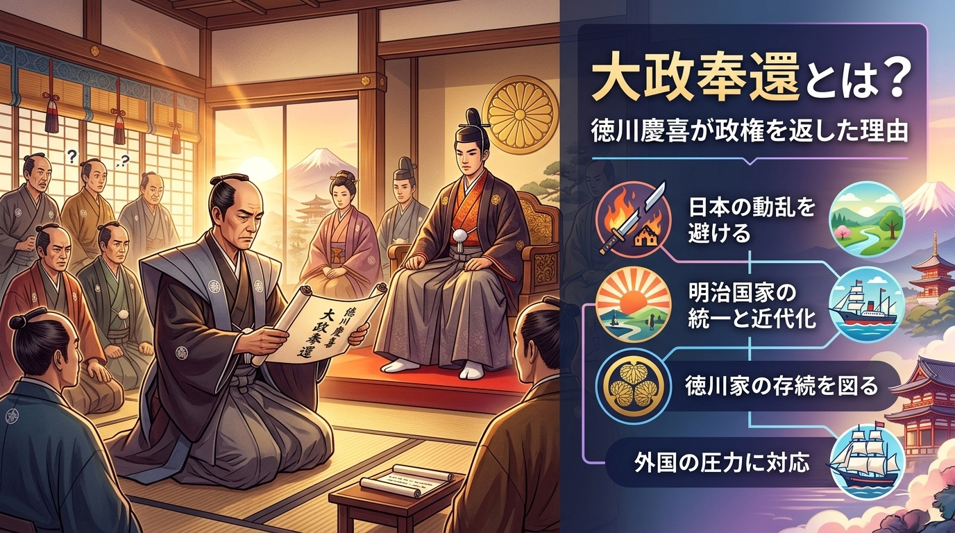 1867年10月14日——265年続いた江戸幕府の支配が、この日に事実上終わりを告げました。将軍・徳川慶喜が「大政奉還」を宣言したこの決断は、日本史上最も重要な政治的転換点の一つです。なぜ慶喜は政権を返したのか、その背景・経緯・影響を詳しく解説します。