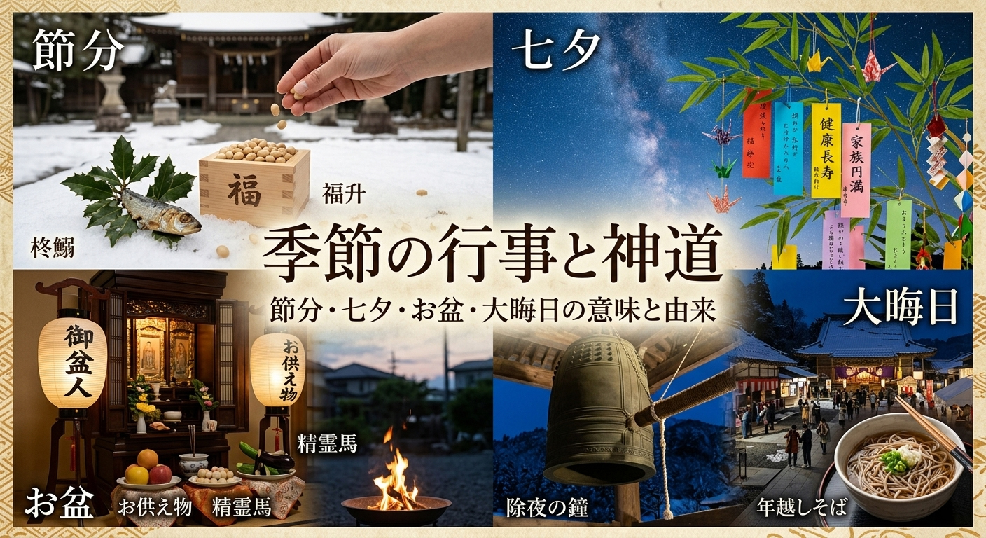 日本には節分・ひな祭り・七夕・お盆・大晦日など、季節ごとに多彩な年中行事があります。これらを「日本の風習」として漠然と楽しんでいる方も多いのではないでしょうか。実はこれらの行事の多くは、神道・仏教・陰陽道・農耕信仰が複雑に絡み合いながら形成された、深い意味を持つ文化的な営みです。本記事では、日本の代表的な季節の行事とその神道的な意味・由来を、一年を通じて解説します。