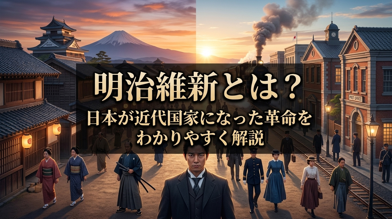 1868年——この年を境に、日本は根本から変わりました。260年続いた江戸幕府が終わり、天皇を中心とした近代国家が誕生した「明治維新」は、世界史でも稀な急速な社会変革として今も研究され続けています。坂本龍馬・西郷隆盛・大久保利通・木戸孝允……幕末シリーズで描いてきたすべての人物と出来事が、この「明治維新」という一点に収束します。本記事では、幕末シリーズの締めくくりとして明治維新の全体像と意義を解説します。