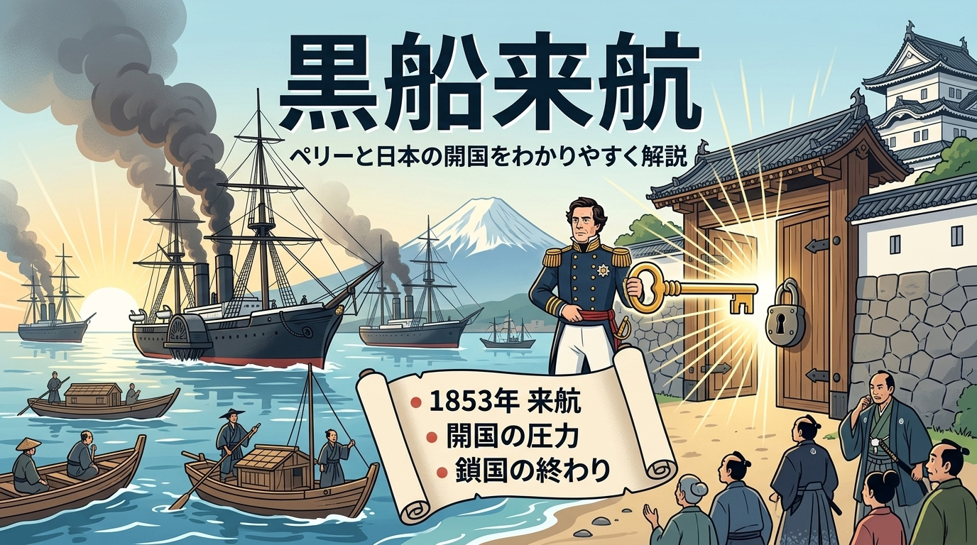 1853年6月3日——この日、日本の歴史は大きく動きました。アメリカの黒塗りの巨大な蒸気船4隻が浦賀沖(神奈川県)に現れ、日本に開国を迫った「黒船来航」は、260年以上続いた江戸幕府の鎖国体制を終わらせ、幕末という激動の時代の幕を開けた歴史的な出来事です。本記事では、黒船来航の経緯・ペリーとはどんな人物か・日本への影響を詳しく解説します。