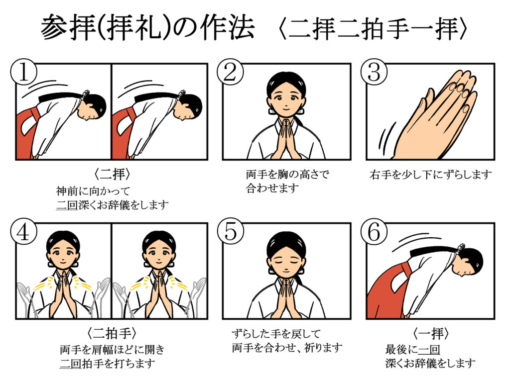 次に「二拝二拍手一拝(にはいにはくしゅいっぱい)」を行います。背筋を伸ばして腰を90度近く折る深いお辞儀(拝)を2回します。次に胸の前で両手を合わせ、右手を少し手前に引いて2回拍手します。両手を合わせたまま祈願や感謝の言葉を心の中で唱えます。最後に再び深いお辞儀(拝)を1回します。