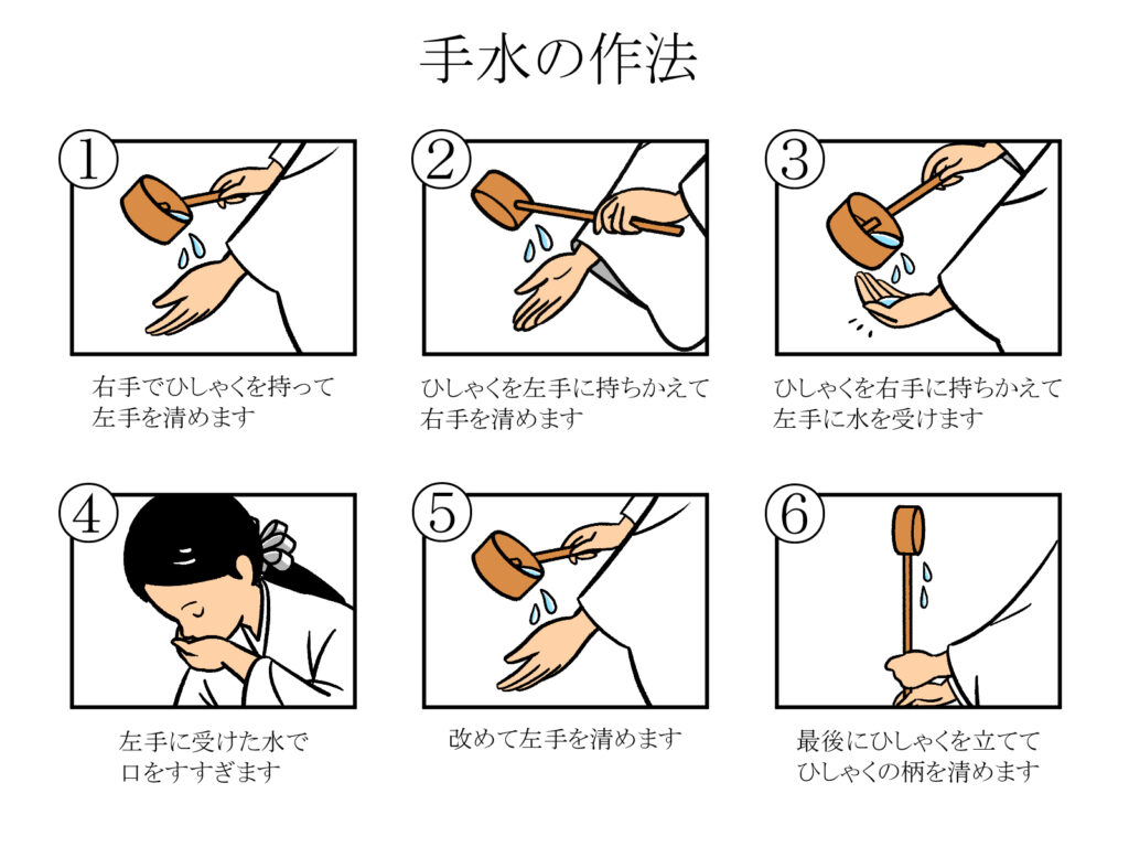 手水舎に着いたら、柄杓を右手で持ち水を汲みます。次に左手を清め、柄杓を左手に持ち替えて右手を清めます。再び右手に柄杓を持ち、左の手のひらに水を受けて口をすすぎます。最後に使った柄杓の柄を清めて元に戻します。